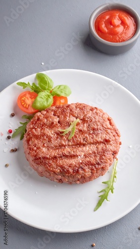 patty, grilled, meat, burger, tomatoes, basil, arugula, sauce, plate, food, dish, fresh, healthy, dinner, meal, appetising, cooked, juicy, tasty, vegetable, herb, ingredient, epicure, delicious, closeup, topview, grey, white