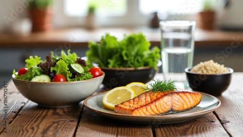 salmon, grilled, meal, healthy, dinner, food, fillet, lemon, salad, fresh, dill, water, rustic, wooden table, alimentary, plate, bowl, green, cookery, light meal, wholesome, diet, eating, seafood, fish, cooked, omega 3, protein, vitamin c, herb, lettuce, cucumber, cherry tomato, grain, drink, kitchen, background, blurred background, indoor, home, appetising, delicious, balanced, wellness, health, table setting, wood texture