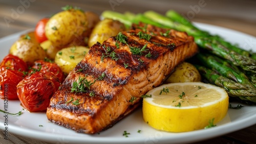 Grilled Salmon Fillet Steak with Roasted Potatoes Asparagus Tomato and Lemon on White Plate Healthy Grilled Salmon Steak Served with Roasted Potatoes Fresh Asparagus Tomato and Lemon
