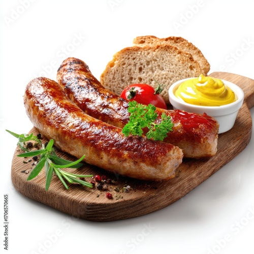 sausage, grilled, board, wooden, bread, mustard, ketchup, herb, rosemary, peppercorn, parsley, tomatoes, food, delicious, appetising, tasty, meal, lunch, dinner, meat, pork meat, cookery, cooking, grilling, bar-b-q, savoury, spicey, hot, fresh, healthy, rustic, simple, classic, traditional, background, white, photo, image, still, life, platter, garnish, side, dish, protein, comfort, favor, aroma