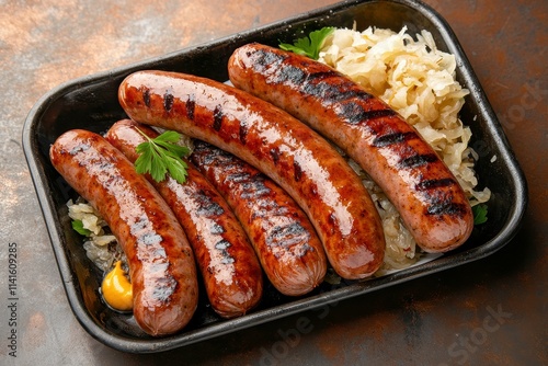Grilled Sausages Served on a Dark Tray with Sauerkraut and Mustard, Perfect for Summer Barbecues and Delicious Outdoor Gatherings with Friends and Family