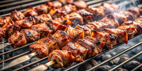 Grilled skewers of spiced meat on charcoal grill reflected