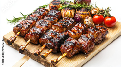Grilled skewers of succulent meat and vegetables on a wooden board, highlighting vibrant colors and rich textures, garnished with rosemary sprigs.