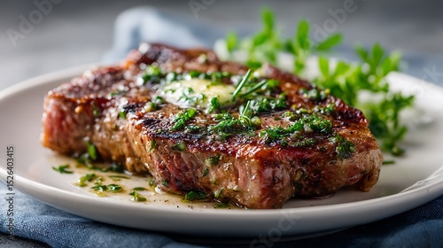 steak, grilled, herb, butter, white plate, food, dinner, meat, cooking, culinary, dish, parsley, seasoning, table setting, gastronomy, meal, served, tasty, presentation