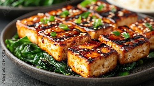tofu, grilled, glazed, glistening, spinach, sesame, seed, green, onion, garnish, rice, side, dish, plate, dark, cube, savoury, delicious, healthy, vegan, vegetarian, protein, asian, cookery, food, meal, dinner, lunch, appetising, tasty, flavorful, fresh, vibrant, cooked, seared, simple, easy, quick, home, eatery, style, preparation, presentation, aesthetic, photo, image