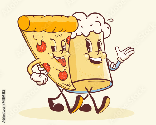 Groovy Pizza and Beer Retro Characters Label. Cartoon Slice and Beverage Glass Mug Walking Smiling Vector Food Mascot Template. Happy Vintage Cool Fast Food Illustration with Typography Isolated