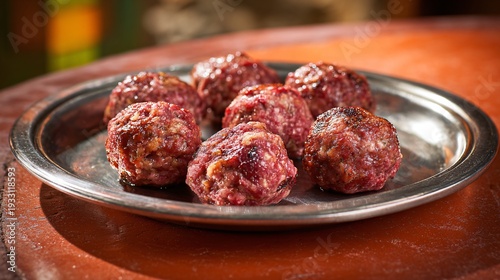 Ground lamb for kofta arranged on metal tray on terracotta table, Mediterranean warmth