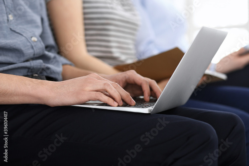 Group of casual dressed business people working at meeting or conference, close-up of hands. Businessman using laptop computer. Teamwork or coaching concept