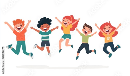 children, jumping, laughing, group, white, background, illustration, simple, style, cute, dreamy, colourful, cartoon, character, happy, expression, vector, file, clean, line, fun, playful, joy, energetic, smiling, cheerful, children, friends, happiness, excitement, together, art, bright, whimsical, adorable, friendly, lively, vibrant, drawing, animation, pose, youth, innocent, celebration, activity, outdoors, childhood