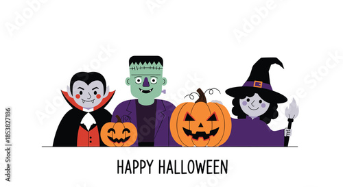 Group of classic Halloween characters including a vampire, Frankenstein, and a witch with pumpkins for festive greeting.