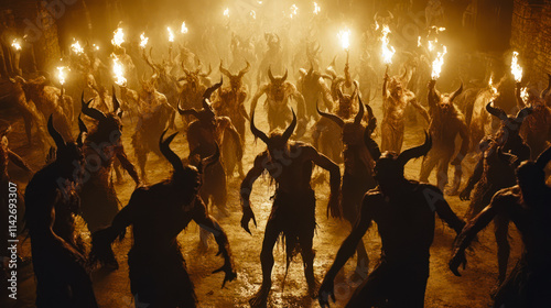Group of demons with horns dancing in hell club