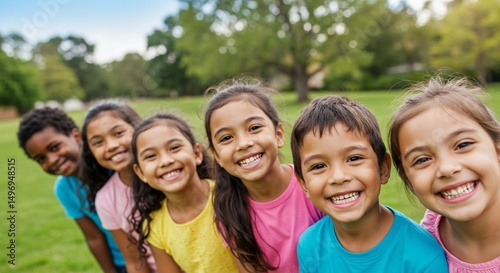 Group of diverse boys and girls children stand in row outdoors. Multicultural kids smiling. Weekend in park. Concept of happy childhood on nature and international friendship unity. Selective focus