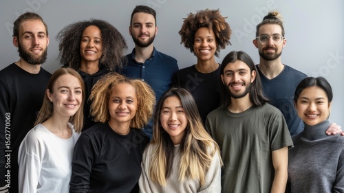 Group of diverse people standing while wearing casual cloth at concrete wall. Attractive multicultural teenager smiling at camera while taking a photo together. Cooperative, collaboration. AIG53.