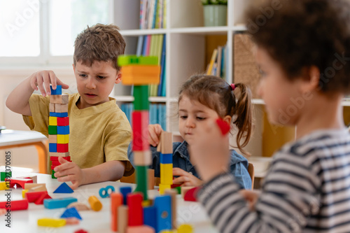 Group of diverse preschool children playing with colorful building blocks at a table in a bright, organized kindergarten classroom.