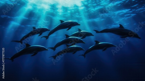 Group of Dolphins Swimming Gracefully in Deep Blue Ocean Water with Sunlight Rays