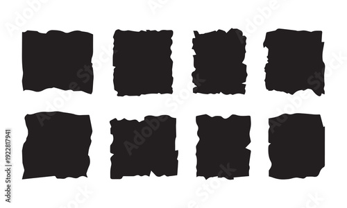 Group of eight black square-like shapes with uneven, torn edges, ideal for distressed design elements.