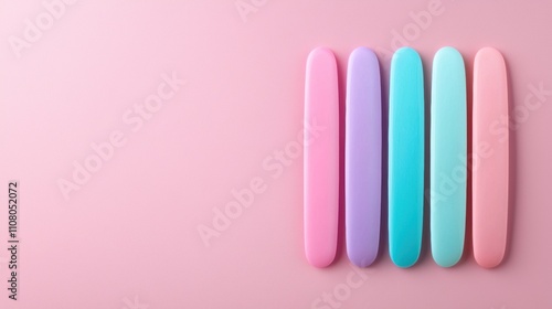Group of five long, thin, rectangular objects arranged in a row on a pink background. the objects are of different colors - pink, purple, blue, and light blue.