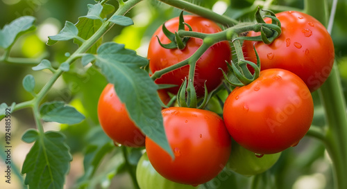 Group of fresh red tomatoes growing on a green plant with water droplets