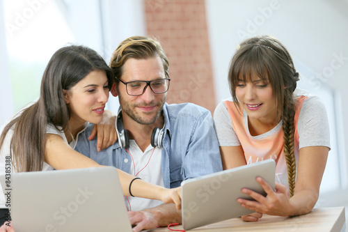 group, girl, man, friends, friendship, young adult, woman, woman, three people, technology, laptop, computer, tablet, touchpad, pad, pda, desk, fun, entertainment, cyberspace, connected, connection, websurfing, web, indoor, inside, home, enjoying, cheerful, communication, studying, smile, smiling, people, caucasian, college, student, digital, electronic, device, smartphone