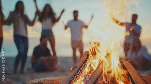 Group of friends dancing around a bonfire on the beach at sunset, festive atmosphere, glowing fire