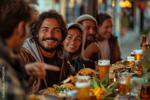 Group of friends enjoying lunch at an outdoor cafe, laughing, eating tacos, and drinking beer together