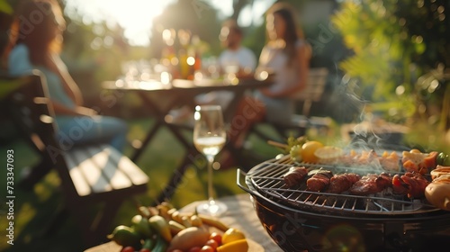 Group of friends having a party outdoors in the garden and barbecue garden grill with beef steaks
