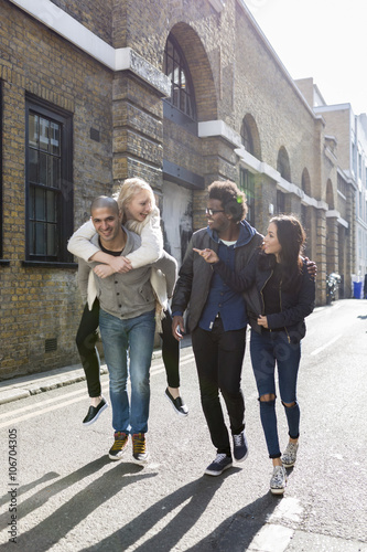 Group of friends having fun on urban street