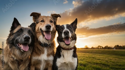 group of happy dogs pose outdoors in a natural mountain setting