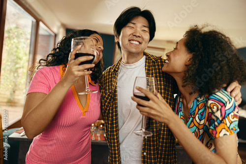 Group of happy young friends is drinking wine while having holiday dinner home party together
