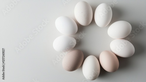 Group of nine white eggs arranged in a circular pattern on a light grey background. the eggs are of different sizes and shapes, with some being round and others being oval-shaped.