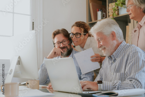 Group of old and middle age business people working and using computer and laptop while sitting at the office desk together discussing project details and opinions