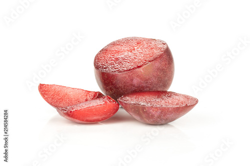 Group of one half three slices of fresh pluot interspecific plums variety isolated on white