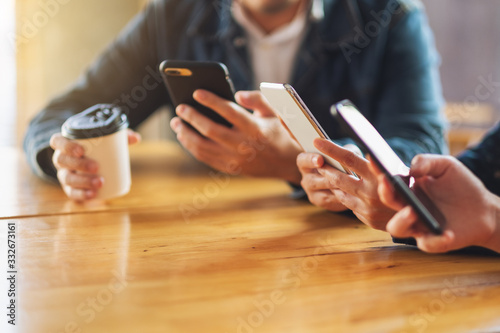 Group of people using and looking at mobile phone while sitting together