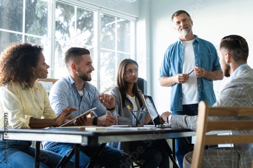 Group of young business people working and communicating while sitting at the office desk together