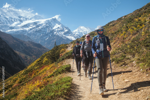 Group womans hikers walking in mountains enjoying outdoor activities together in Himalayas, Nepal. Travel, outdoor group sport lifestyle concept.