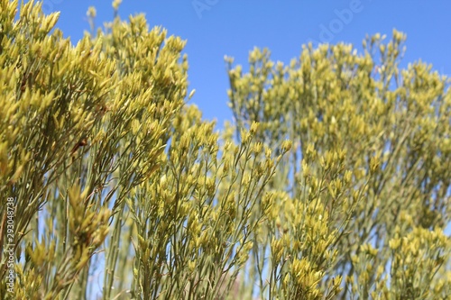 Growing in Joshua Tree National Park of the Southern Mojave Desert is this native shrub, known commonly as Mojave Rubber Rabbitbrush, and botanically as Ericameria Nauseosa.