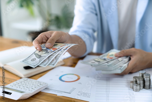 Growing savings concept. Saving money by hand putting coins money banknotes in jug glass financial accounting planning.