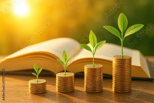 Growth Concept with Coins and Book Symbolizing Education and Financial Success