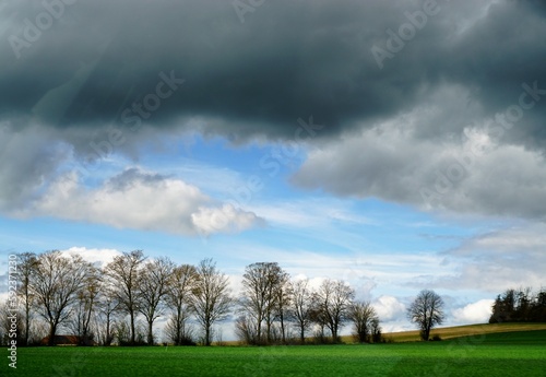Grüne Landschaft Panorama mit Wiese und Baumreihe vor Himmel mit grauweißem Wolkengebilde bei Sonne und Regen am Abend im Frühling