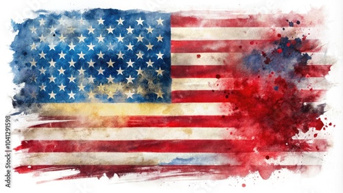 Grunge watercolor American flag artwork, perfect for patriotic themes, ideal background for USA-inspired projects, capturing the essence of freedom and national pride.