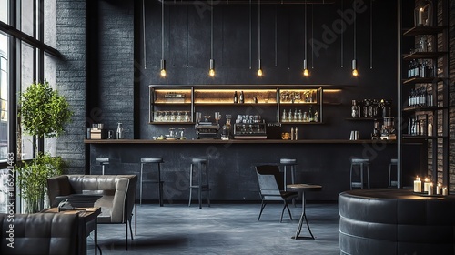 bar, interior, industrial, moody, dark, grimy, design, lighting, furniture, stool, counter, decor, modern, stylish, architecture, urban, ambience, minimalist, plant, wood, metal, glasses, seating, comfortable, cosy, space, contemporary, shadow, texture, aesthetic, environment, upscale, atmosphere, hospitality, drink, layout, cafes, trendy, chic, elegant, unique, visual, photo, image