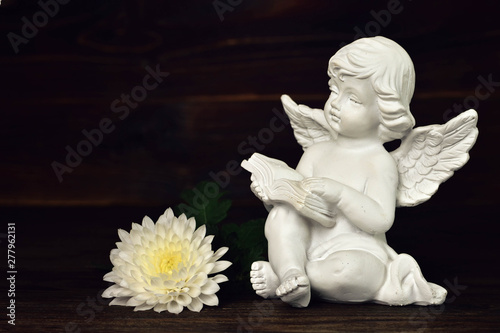 guardian angel, book, funeral, flower, sympathy, card, condolence, angel, memorial, cherub, children, baby, loss, white, all saints' day, chrysanthemum, death, reading, praying, tree branch, blooming, blossom, figurine, little, young, burial, love, remembrance, religious, wooden, background, sorrowful, grief, grieved, sculpture, sitting, decoration, flower petals