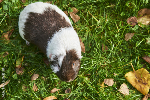 Guinea pigs in the grass eating. Domestic animal in the outdoor in the green grass lawn