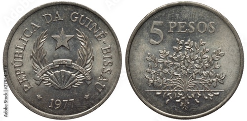 Guinea-Bissau coin 5 five pesos 1977, arms, star flanked by sprigs, peanut sprouts below denomination,