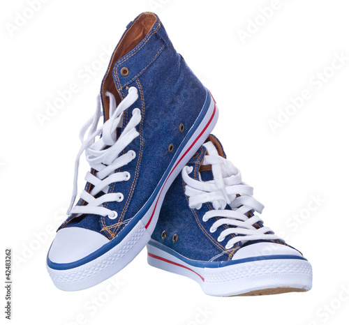 denim, footwear, shoe, activewear, wear, athletic, background, blue, canvas, casual attire, clean, clothing, contemporary, copy, exercising, fashion, grey, health, hip, horizontal, isolated, lace, new, nobody, pair, rag, revival, rubber, run, rundown, shoelace, side, sneaker, sport, studio, trainer, training, trendy, 2, untied, walking, white