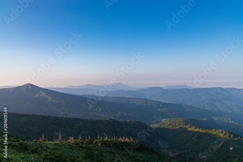 mountain, landscape, sky, mountain, nature, blue, view, cloud, cloud, hill, fog, forest, green, panorama, summer, travel, park, scenic, morning, beautiful, vale, outdoors, high, hill, background, dawn, dusk, environment, evening, japan, japanese, light, mist, natural, national park