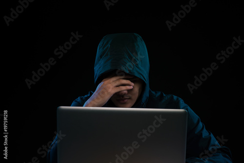 Hacker in a dark hoody sitting in front of a notebook. Computer privacy attack