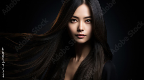 Hair Perfection, Asian Beauty with Silky Straight Hair Against a Stylish Black Background.