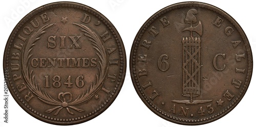 Haiti, Haitian coin six centimes 1846, dark bronze, inscriptions in French six centimes, Haitian republic, liberty and equality, year 43 of local chronology, fascia and hatchet,
