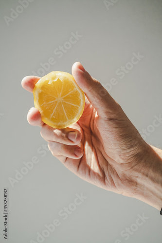 Half of a yellow sour lemon in а hand on a gray background. A warm morning vitamin concept.